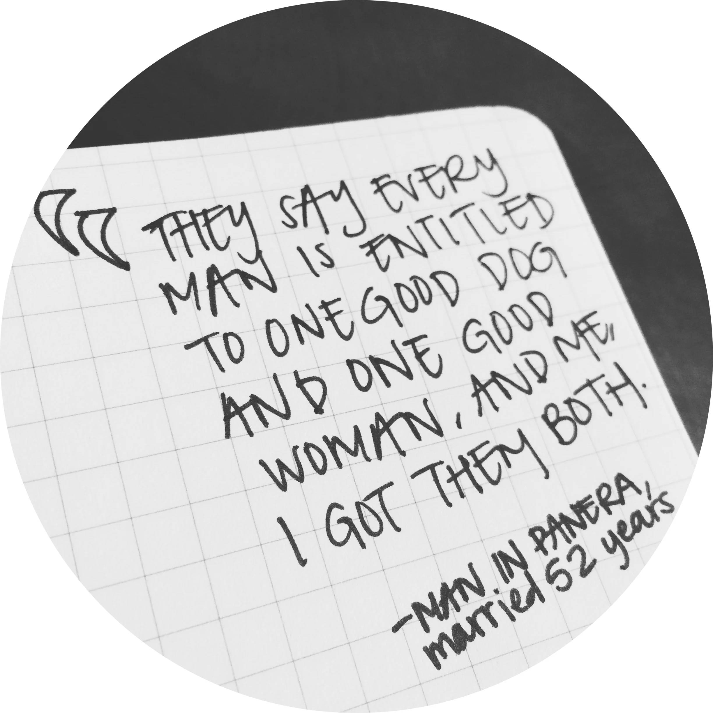 The first two haven’t stopped talking since I walked in. There’s a joyful constant banter between them. There’s a crossword puzzle on the table between them, she has the pen, he’s telling her what to write. They have matching coffee mugs pushed to the side, empty and obviously enjoyed. They can’t take their eyes off of each other. He’s telling her stories, gesturing big and wide, and she laughs so much she starts coughing while he pauses until she recovers. Their love is clear, simple, sweet. Their faces are weathered and covered in deep wrinkles that show they’ve gone through much over the years. I wonder if this is their weekly routine, if this is their spot, if they always share crossword puzzles and coffee like this. I look at them and see the kind of love I hope to have--the kind of love that doesn’t need a five star restaurant and a fancy date and a big show of things, the kind of love that they can’t help but share with the man clearing away their plates.