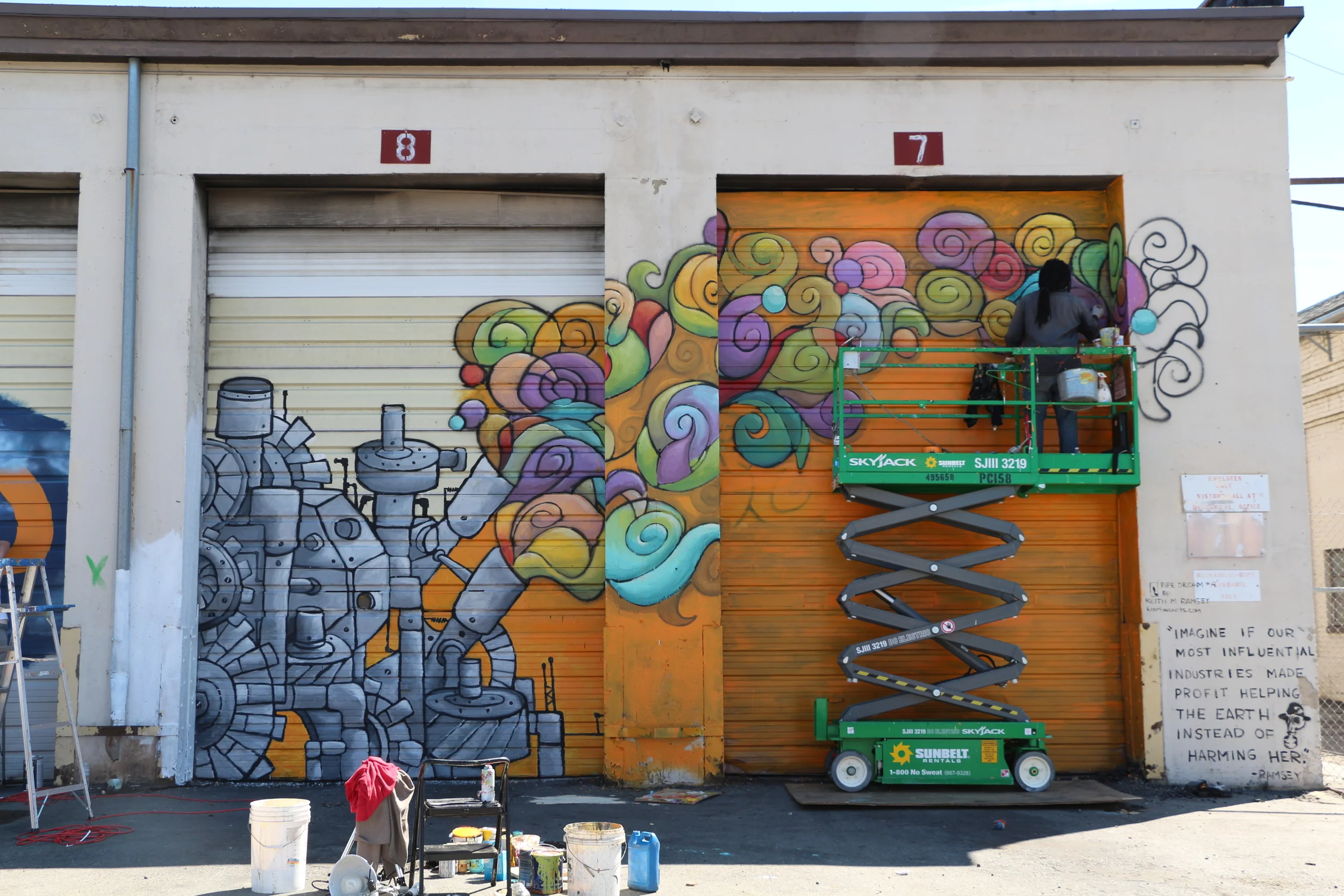 As I entered, I saw a man painting. He was working on a stretch of wall outside of the main area, on a side street with little traffic and few passersby. I stopped and watched him work for a few moments. He wasn't being showy or dramatic or drawing any attention to himself, he was just quietly at work on a stretch of coated brick on a design I couldn't quite make out yet.