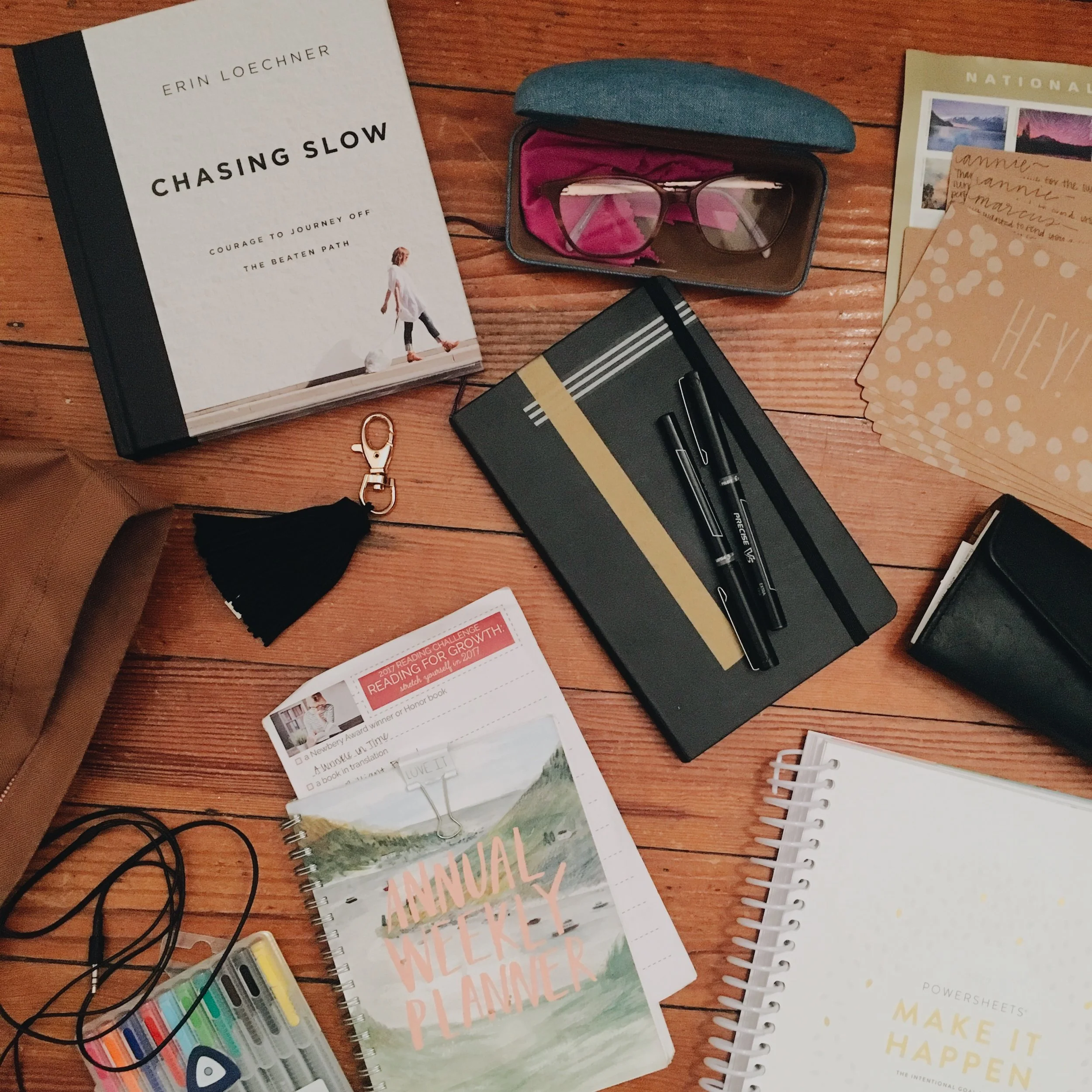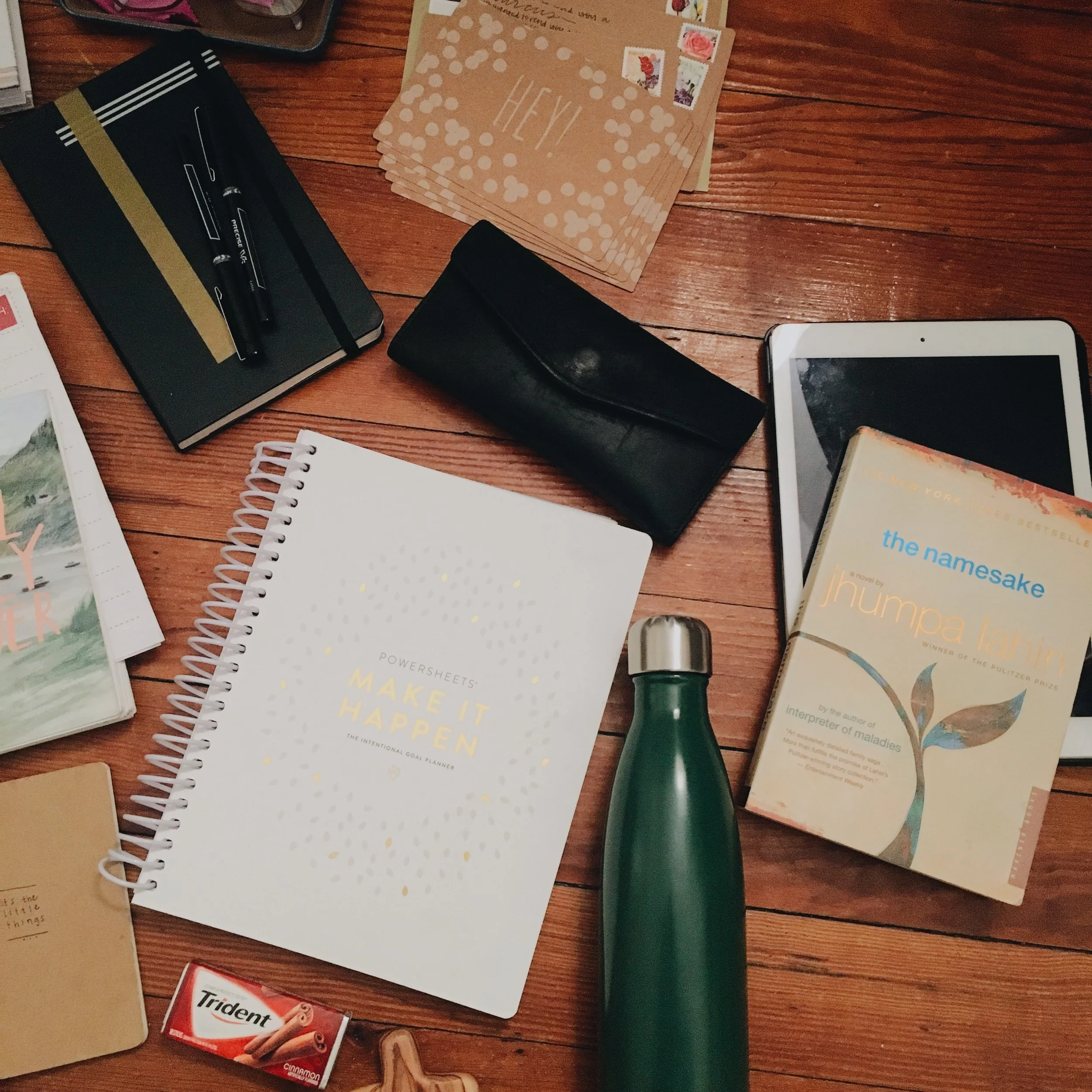- My Moleskine again, my planner again, that tassel again, wallet again, postcards again, PowerSheets again, etc.